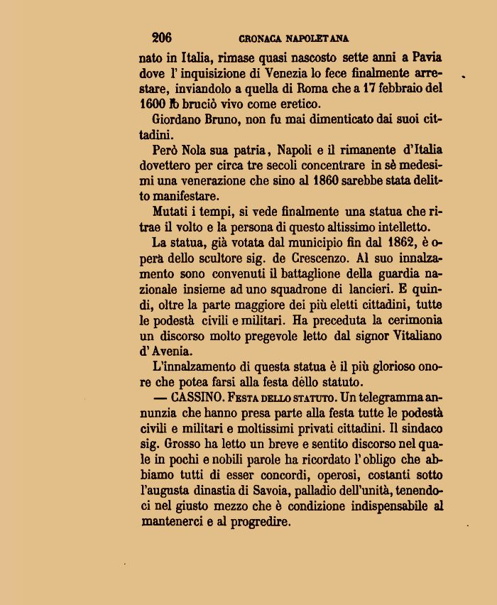 Però Nola sua patria, Napoli e fi rimanente d'Italia dovettero per circa tre secoli concentrare in sè medesimi una venerazione che sino al 1860 sarebbe stata delitto manifestare.