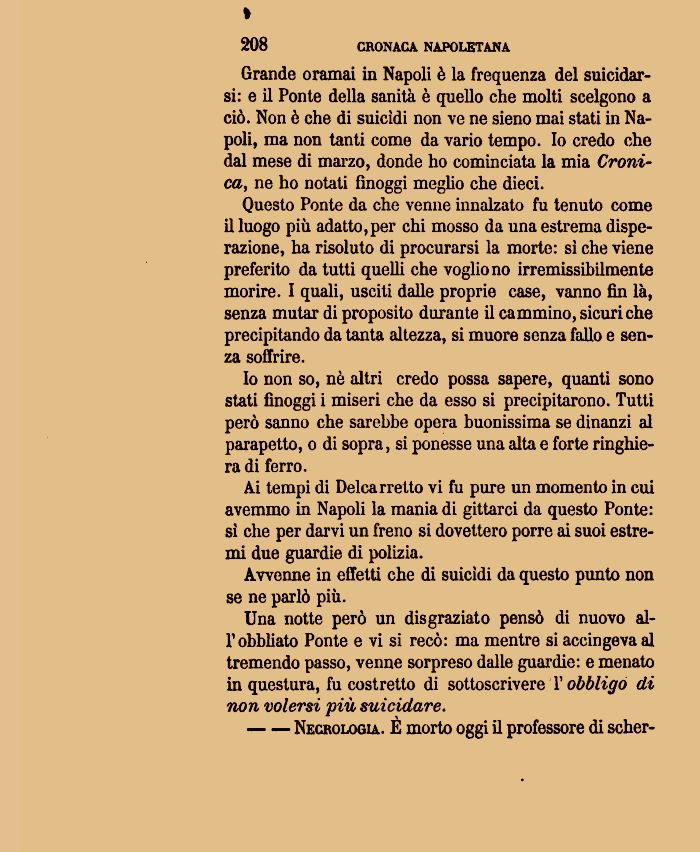 Grande oramai in Napoli è la frequenza del suicidarsi: e il Ponte della sanità è quello che molti scelgono a ciò. Non è che di suicìdi non ve ne sieno mai stati in Napoli, ma non tanti come da vario tempo. Io credo che dal mese di marzo, donde ho cominciata la mia Cronica, ne ho notati fìnoggi meglio che dieci.