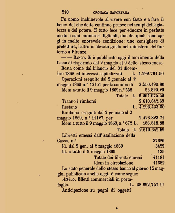 Operazioni eseguite dal 2 gennaio al 2 maggio 1869 n.° 12451 per la somma di 2.550.490.80 Idem a'tutto il 9 maggio 1869 n.° 558 53.820.29