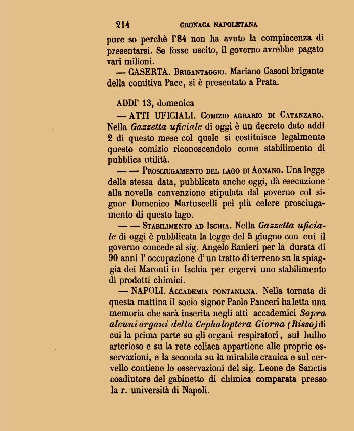 — NAPOLI. Accademia pontaniana. Nella tornata di questa mattina il socio signor Paolo Panceri ha letta una memoria che sarà inserita negli atti accademici Sopra alcuni organi della Cephaloptera Giorna (Risso)ài cui la prima parte su gli organi respiratori, sul bulbo arterioso e su la rete celiaca appartiene alle proprie osservazioni, e la seconda su la mirabile cranica e sul cervello contiene le osservazioni del sig. Leone de Sanctis coadiutore del gabinetto di chimica comparata presso la r. università di Napoli.