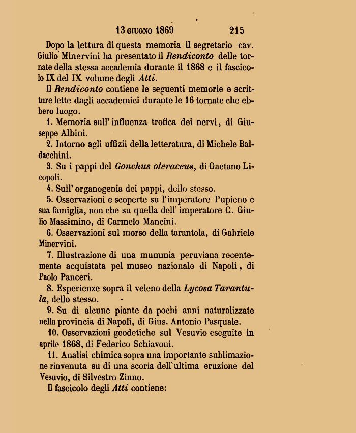 Dopo la lettura di questa memoria il segretario cav. Giulio Minervini ha presentato il Rendiconto delle tornate della stessa accademia durante il 1868 e il fascicolo IX del IX volume degli Atti.