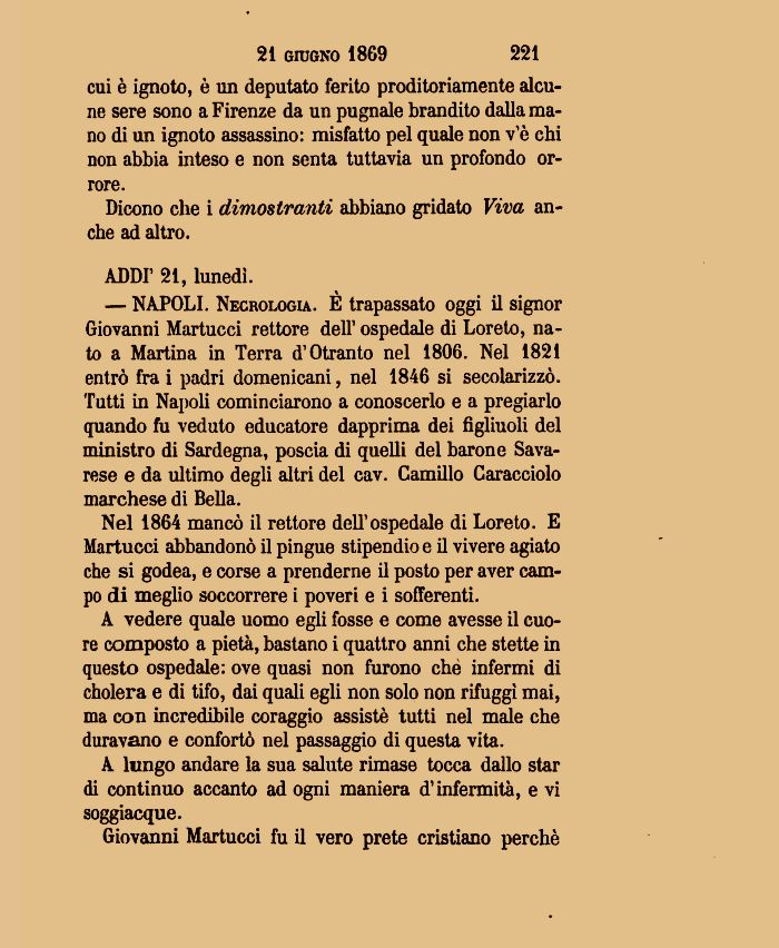 — NAPOLI. Necrologia. è trapassato oggi il signor Giovanni Martucci rettore dell' ospedale di Loreto, nato a Martina in Terra d'Otranto nel 1806. Nel 1821 entrò fra i padri domenicani, nel 1846 si secolarizzò. Tutti in Napoli cominciarono a conoscerlo e a pregiarlo quando fu veduto educatore dapprima dei figliuoli del ministro di Sardegna, poscia di quelli del barone Sava-rese e da ultimo degli altri del cav. Camillo Caracciolo marchese di Bella.