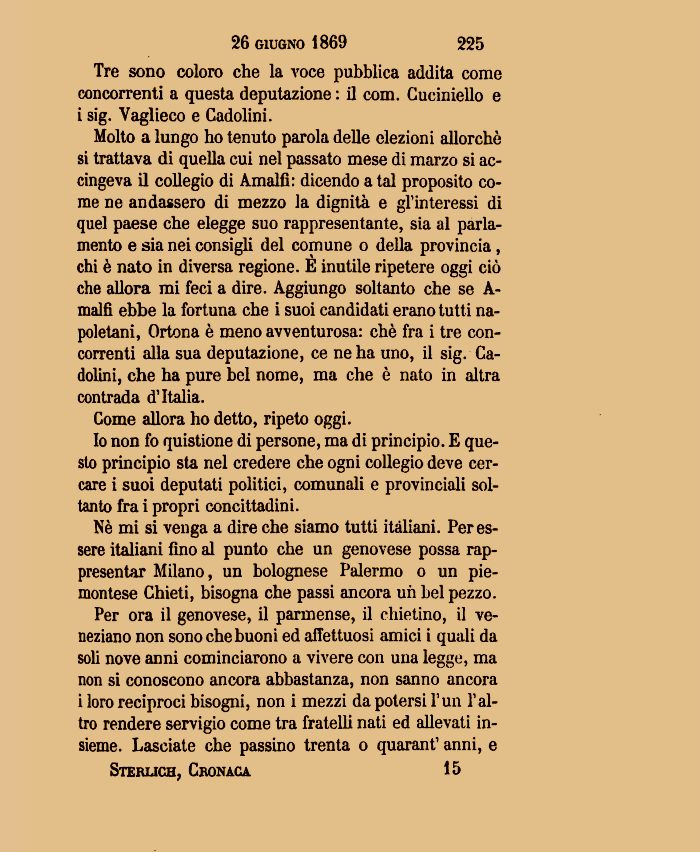 Nè mi si venga a dire che siamo tutti italiani. Per essere italiani fino al punto che un genovese possa rappresentar Milano, un bolognese Palermo o un piemontese Chieti, bisogna che passi ancora uh bel pezzo.