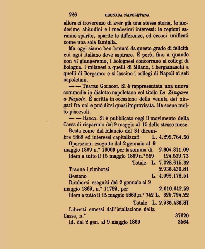 Operazioni eseguite dal 2 gennaio al 9 maggio 1869 n.° 13009 per la somma di 2.604.311.09 Idem a tutto il 15 maggio 1869n.°559 124.539.73