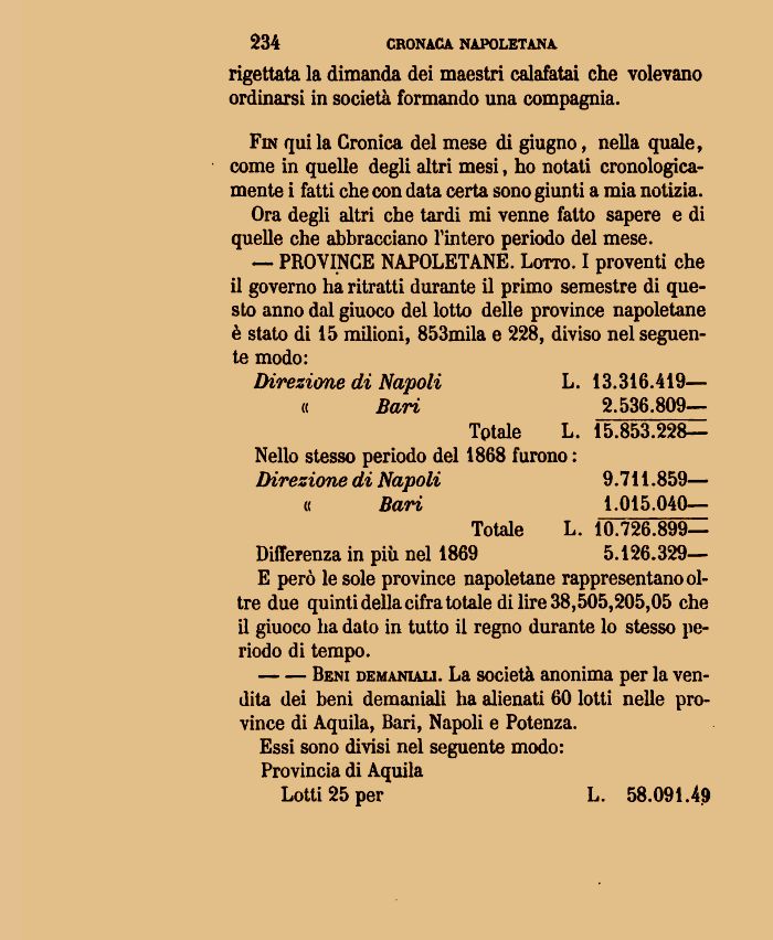 E però le sole province napoletane rappresentano oltre due quinti della cifra totale di lire 38,505,205,05 che il giuoco ha dato in tutto il regno durante lo stesso periodo di tempo.