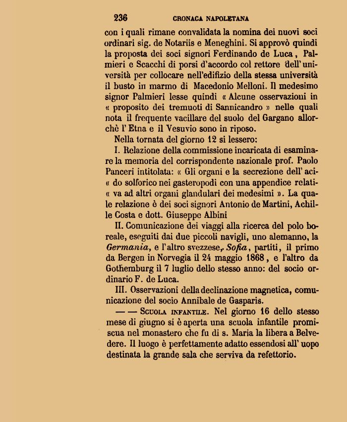 II. Comunicazione dei viaggi alla ricerca del polo boreale, eseguiti dai due piccoli navigli, uno alemanno, la Germania, e l'altro svezzese? Sofia, partiti, il primo da Bergen in Norvegia il 24 maggio 1868, e l'altro da Gothemburg il 7 luglio dello stesso anno: del socio ordinario F. de Luca.
