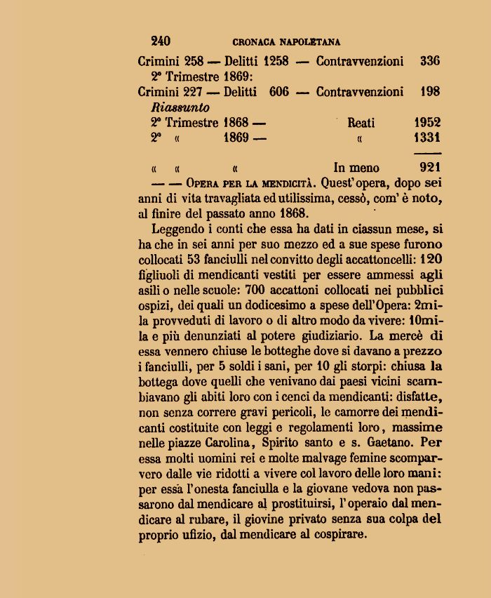 Leggendo i conti che essa ha dati in ciassun mese, si ha che in sei anni per suo mezzo ed a sue spese furono collocati 53 fanciulli nel convitto degli accattoncelli: 120 figliuoli di mendicanti vestiti per essere ammessi agli asili o nelle scuole: 700 accattoni collocati nei pubblici ospizi, dei quali un dodicesimo a spese dell'Opera: 2mi-la provveduti di lavoro o di altro modo da vivere: 1 Ornila e più denunziati al potere giudiziario. La mercè di essa vennero chiuse le botteghe dove si davano a prezzo i fanciulli, per 5 soldi i sani, per 10 gli storpi: chiusa la bottega dove quelli che venivano dai paesi vicini scambiavano gli abiti loro con i cenci da mendicanti: disfatte, non senza correre gravi pericoli, le camorre dei mendicanti costituite con leggi e regolamenti loro, massime nelle piazze Carolina, Spirito santo e s. Gaetano. Per essa molti uomini rei e molte malvage femine scomparvero dalle vie ridotti a vivere col lavoro delle loro mani: per essa l'onesta fanciulla e la giovane vedova non passarono dal mendicare al prostituirsi, l'operaio dal mendicare al rubare, il giovine privato senza sua colpa del proprio ufizio, dal mendicare al cospirare.
