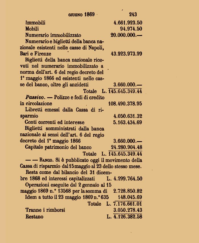 Libretti emessi dalla Gassa di risparmio 4.050.631.32 Conti correnti ed interesse 5.163.434.69 Biglietti somministrati dalla banca nazionale ai sensi dell'art. 6 del regio decreto del 1° maggio 1866 3.660.000.— Capitale patrimonio del banco 24.280.904.48
