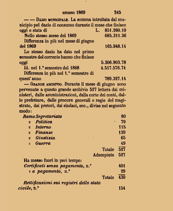 — Grande archìvio. Durante il mese di giugno sono pervenute a questo grande archivio 527 lettera dai ministeri, dalle amministrazioni, dalla corte dei conti, dalle prefetture, dalle procure generali e regie del magistrato, dai pretori, dai sindaci, ecc., divise nel seguente