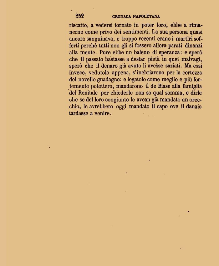 riscatto, a vedersi tornato in poter loro, ebbe a rimanerne come privo dei sentimenti. La sua persona quasi ancora sanguinava, e troppo recenti erano i martiri sofferti perchè tutti non gli si fossero allora parati dinanzi alla mente. Pure ebbe un baleno di speranza: e sperò che il passato bastasse a destar pietà in quei malvagi, sperò che il denaro già avuto li avesse saziati. Ma essi invece, vedutolo appena, s'inebriarono perla certezza del novello guadagno: e legatolo come meglio e più fortemente potettero, mandarono il de Biase alla famiglia del Renitale per chiederle non so qual somma, e dirle che se del loro congiunto le avean già mandato un orecchio, le avrebbero oggi mandato il capo ove il danaio tardasse a venire.