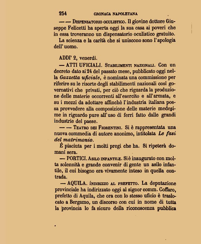 --Dispensatorio oculistico. Il giovine dottore Giuseppe Felicetti ha aperta oggi la sua casa ai poveri che in essa troveranno un dispensatorio oculistico gratuito.
