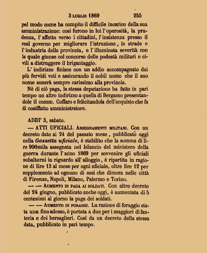 — ATTI UFICIALI. Assegnamenti militari. Con un decreto dato ai 24 del passato mese , pubblicato oggi nella Gazzetta ufieiale, è stabilito che la somma di lire 900mila assegnata nel bilancio del ministero della guerra durante l'arino 1869 per sovvenire gli uficiali subalterni in riguardo all' alloggio, è ripartita in ragione di lire 13 al mese per ogni ufieiale, oltre lire 12 per supplemento ad ognuno di essi che dimora nelle città di Firenze, Napoli, Milano, Palermo e Torino.