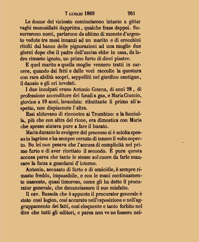 I due incolpati erano Antonio Cotena, di anni 28 , di professione accenditore dei fanali a gas, e Maria Ciuccio, giovine a 19 anni, lavandaia: ributtante il primo all'aspetto, non dispiacente Y altra.