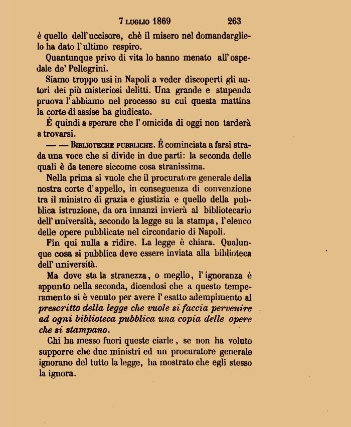 Ma dove sta la stranezza, o meglio, l'ignoranza è appunto nella seconda, dicendosi che a questo temperamento si è venuto per avere l'esatto adempimento al prescritto della legge che vuole si faccia pervenire ad ogni biblioteca pubblica una copia delle opere che si stampano.