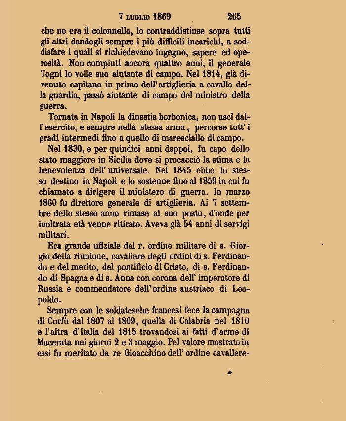 Nel 1830, e per quindici anni dappoi, fu capo dello stato maggiore in Sicilia dove si procacciò la stima e la benevolenza dell'universale. Nel 1845 ebbe lo stesso destino in Napoli e lo sostenne fino al 1859 in cui fu chiamato a dirigere il ministero di guerra. In marzo 1860 fu direttore generale di artiglieria. Ai 7 settembre dello stesso anno rimase al suo posto, d'onde per inoltrata età venne ritirato. Aveva già 54 anni di servìgi militari.