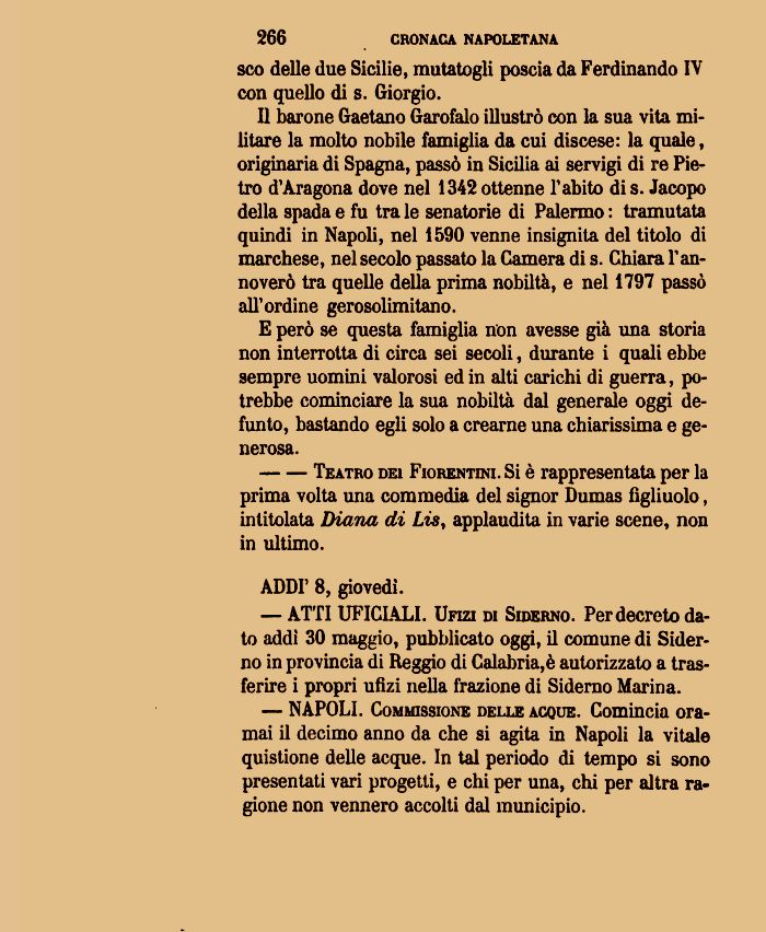 — NAPOLI. Commissione delle acque. Comincia oramai il decimo anno da che si agita in Napoli la vitale quistione delle acque. In tal periodo di tempo si sono presentati vari progetti, e chi per una, chi per altra ragione non vennero accolti dal municipio.