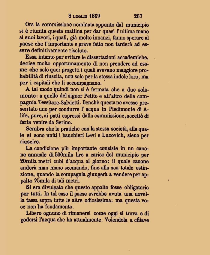 A tal modo quindi non si è fermata che a due solamente: a quello del signor Petito e all'altro della compagnia Tessitore-Salvietti. Benché questa ne avesse presentato uno per condurre 1' acqua in Piedimonte di A-life, pure, ai patti espressi dalla commissione,accettò di farla venire da Serino.