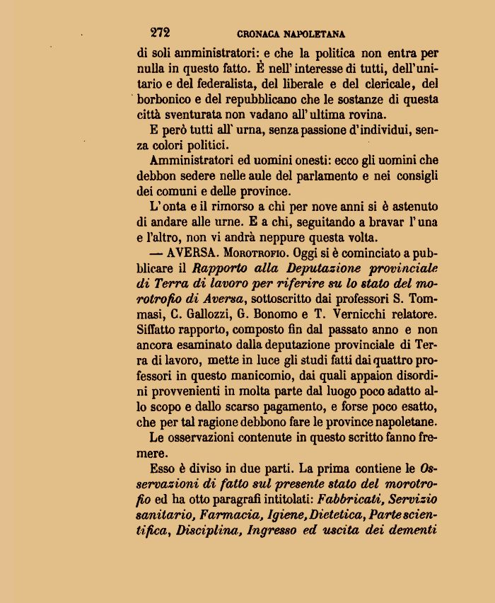 — A VERSA. Morotrofio. Oggi si è cominciato a pubblicare il Rapporto alla Deputazione provinciale di Terra di lavoro per riferire su lo stato del morotrofio di Aversa, sottoscritto dai professori S. Tom-mas i, C. Gallozzi, G. Bonomo e T. Vernicchi relatore. Siffatto rapporto, composto fin dal passato anno e non ancora esaminato dalla deputazione provinciale di Terra di lavoro, mette in luce gli studi fatti dai quattro professori in questo manicomio, dai quali appaion disordini provvenienti in molta parte dal luogo poco adatto allo scopo e dallo scarso pagamento, e forse poco esatto, che per tal ragione debbono fare le province napoletane.