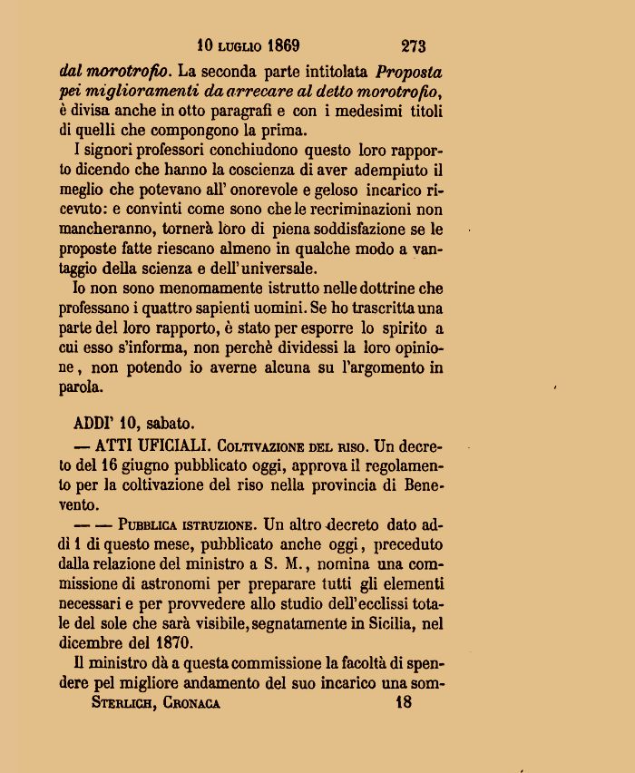 --Pubblica istruzione. Un altro decreto dato addì 1 di questo mese, pubblicato anche oggi, preceduto dalla relazione del ministro a S. M., nomina una commissione dì astronomi per preparare tutti gli elementi necessari e per provvedere allo studio dell'ecclissi totale del sole che sarà visibile, segnatamente in Sicilia, nel dicembre del 1870.