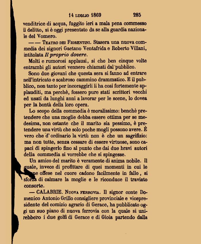 — CALABRIE. Nuova ferrovia. Il signor conte Domenico Antonio Grillo consigliere provinciale e vicepresidente del comìzio agrario di Gerace, ha pubblicato oggi un suo piano di nuova ferrovia con la quale si unirebbero i due golfi di Gerace e di Gioia partendo dalla