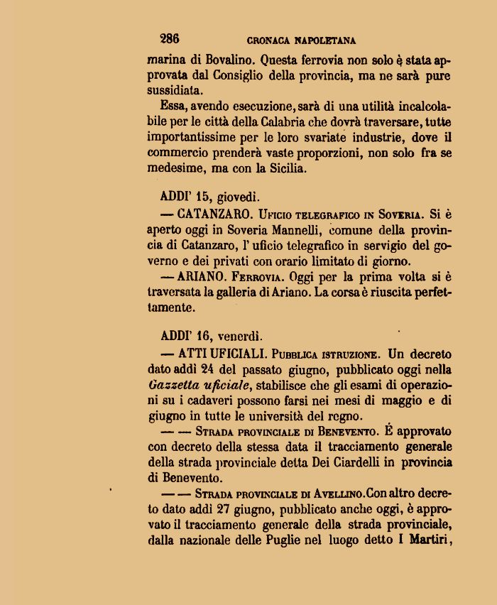 — ARIANO. Ferrovia. Oggi per la prima volta si è traversata la galleria di Ariano. La corsa è riuscita perfettamente.