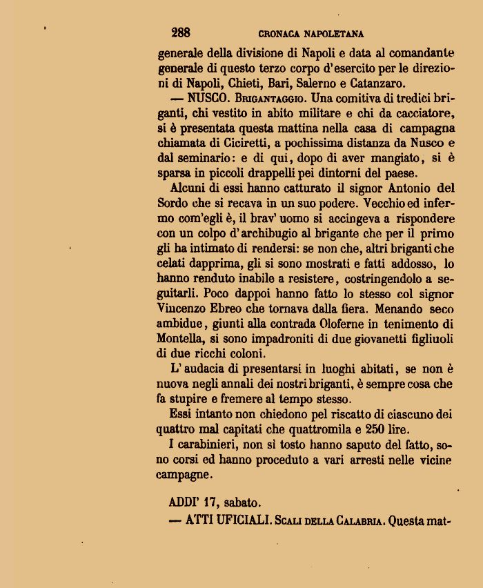 — NUSCO. Brigantaggio. Una comitiva di tredici briganti, chi vestito in abito militare e chi da cacciatore, si è presentata questa mattina nella casa di campagna chiamata di Ciciretti, a pochissima distanza da Nusco e dal seminario: e di qui, dopo di aver mangiato, si è sparsa in piccoli drappelli pei dintorni del paese.