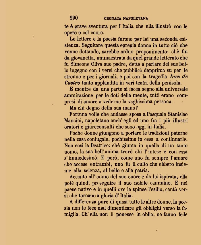 Fortuna volle che andasse sposa a Pasquale Stanislao Mancini, napoletano anch' egli ed uno fra i più illustri oratori e giureconsulti che sono oggi in Italia.