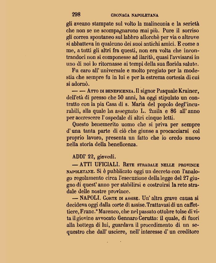 dell'età di presso che 50 anni, ha oggi stipulato un contratto conia pia Casa di s. Maria del popolo degl'incurabili, alla quale ha assegnato L. 2mila e 86 all'anno per accrescere l'ospedale di altri cinque letti.