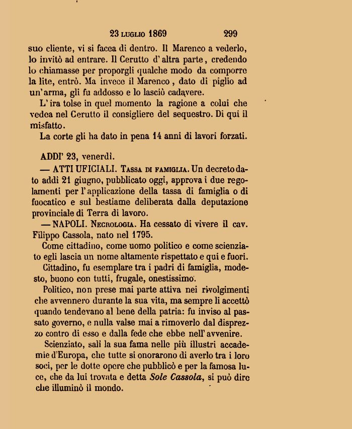 — NAPOLI. Necrologia. Ha cessato di vivere il cav. Filippo Cassola, nato nel 1795.