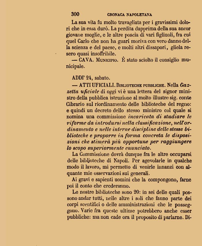 La Commissione dovrà dunque fra le altre occuparsi delle biblioteche di Napoli. Per agevolarle in qualche modo il lavoro, mi permetto di venirle innanzi con alquante mie osservazioni sui generali.