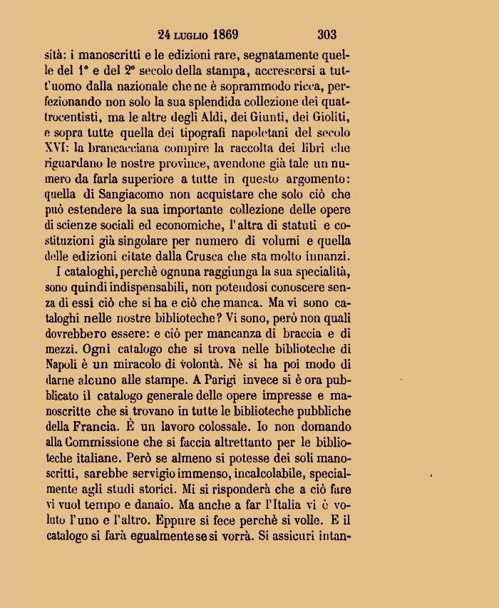 sita: i manoscritti e le edizioni rare, segnatamente quelle del 1° e del 2° secolo della stampa, accrescersi a tut-t'uomo dalla nazionale che ne è soprammodo ricca, perfezionando non solo la sua splendida collezione dei quattrocentisti, ma le altre degli Aldi, dei Giunti, dei Gioliti, e sopra tutte quella dei tipografi napoletani del secolo XVI: la hrancacciana compire la raccolta dei libri che riguardano le nostre province, avendone già tale un numero da farla superiore a tutte in questo argomento : quella di Sangiacomo non acquistare che solo ciò che può estendere la sua importante collezione delle opere di scienze sociali ed economiche, 1' altra di statuti e costituzioni già singolare per numero di volumi e quella delle edizioni citate dalla Crusca che sta molto innanzi, I cataloghi, perchè ognuna raggiunga la sua specialità, sono quindi indispensabili, non potendosi conoscere senza di essi ciò che si ha e ciò che manca. Ma vi sono cataloghi nelle nostre biblioteche? Vi sono, però non quali dovrebbero essere: e ciò per mancanza di braccia e di mezzi. Ogni catalogo che si trova nelle biblioteche di Napoli è un miracolo di volontà. Nè si ha poi modo di darne alcuno alle stampe. A Parigi invece si è ora pubblicato il catalogo generale delle opere impresse e manoscritte che si trovano in tutte le biblioteche pubbliche della Francia. E un lavoro colossale. Io non domando alla Commissione che si faccia altrettanto per le biblioteche italiane. Però se almeno si potesse dei soli manoscritti, sarebbe servìgio immenso, incalcolabile, specialmente agli studi storici. Mi si risponderà che a ciò fare vi vuol tempo e danaio. Ma anche a far F Italia vi è voluto l'uno e l'altro. Eppure si fece perchè si volle. E il catalogo si farà egualmente se si vorrà. Si assicuri intan-