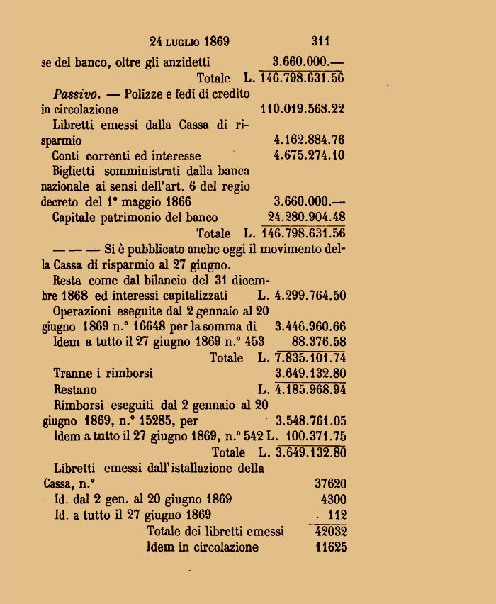 Libretti emessi dalla Gassa di risparmio 4.162.884.76 Conti correnti ed interesse 4.675.274.10 Biglietti somministrati dalla banca nazionale ai sensi dell'art. 6 del regio decreto del 1° maggio 1866 3.660.000.— Capitale patrimonio del banco 24.280.904.48