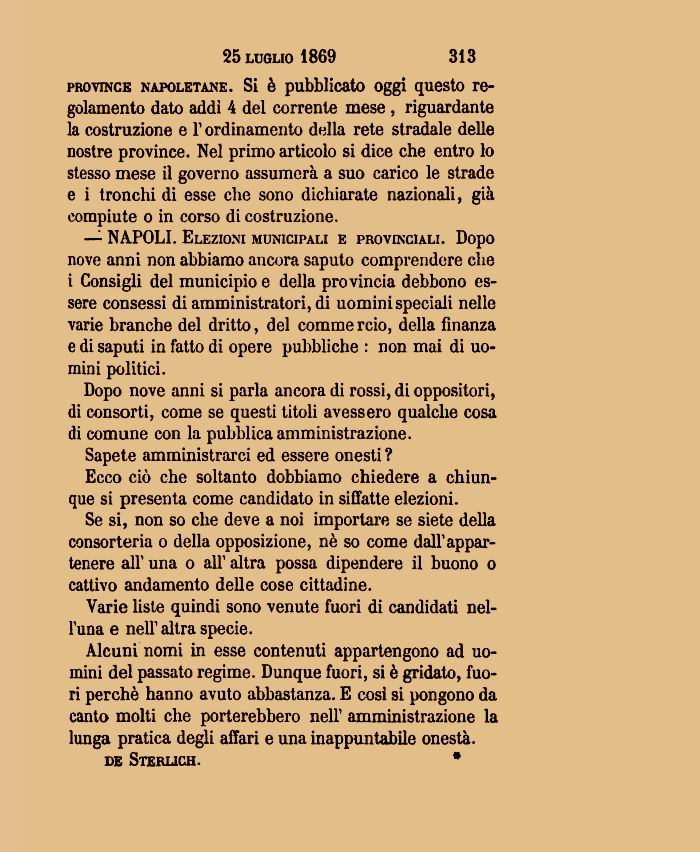 — NAPOLI. Elezioni municipali e provinciali. Dopo nove anni non abbiamo ancora saputo comprendere che i Consigli del municipio e della provincia debbono essere consessi di amministratori, di uomini speciali nelle varie branche del dritto, del commercio, della finanza e di saputi in fatto di opere pubbliche : non mai di uomini politici.