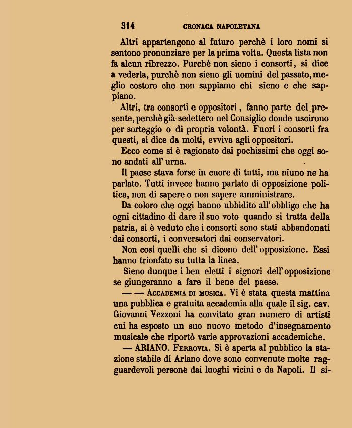 — ARIANO. Ferrovia. Si è aperta al pubblico la stazione stabile di Ariano dove sono convenute molte ragguardevoli persone dai luoghi vicini e da Napoli. U si-