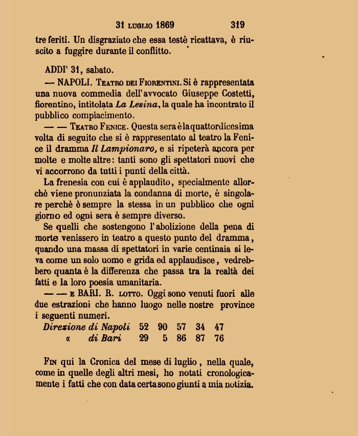 — NAPOLI. Teatro dei Fiorentini. Si è rappresentata una nuova commedia dell'avvocato Giuseppe Costetti, fiorentino, intitolata La Lesina, la quale ha incontrato il pubblico compiacimento.