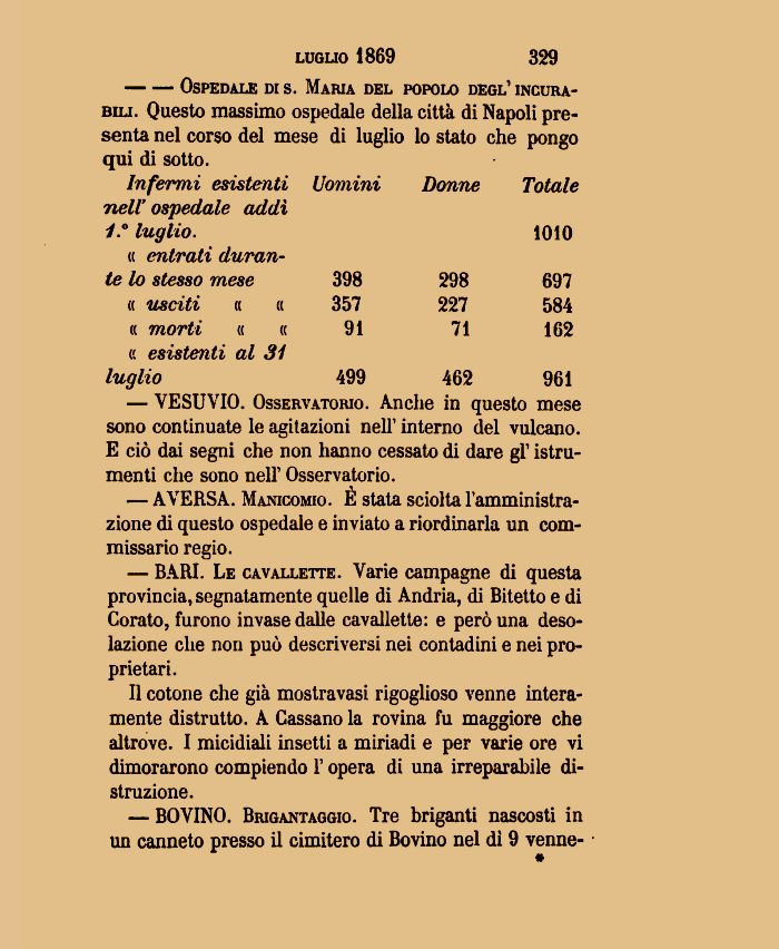 --Ospedale di s. Maria del popolo degl' incurabili. Questo massimo ospedale della città di Napoli presenta nel corso del mese di luglio lo stato che pongo qui di sotto.