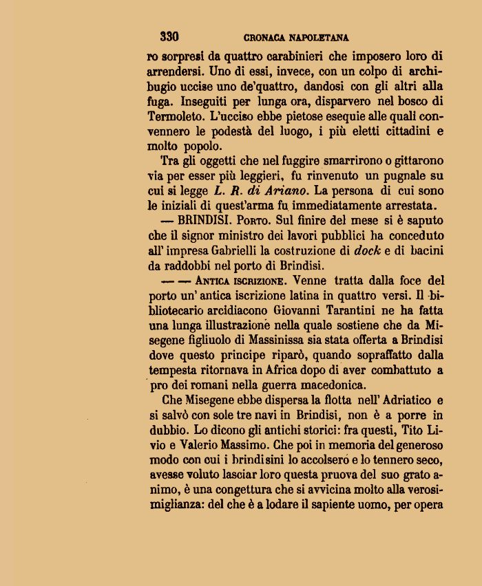 — — Antica iscrizione. Venne tratta dalla foce del porto un' antica iscrizione latina in quattro versi. Il bibliotecario arcidiacono Giovanni Tarantini ne ha fatta una lunga illustrazione nella quale sostiene che da Mi-segene figliuolo di Massinissa sia stata offerta a Brindisi dove questo principe riparò, quando sopraffatto dalla tempesta ritornava in Africa dopo di aver combattuto a prò dei romani nella guerra macedonica.