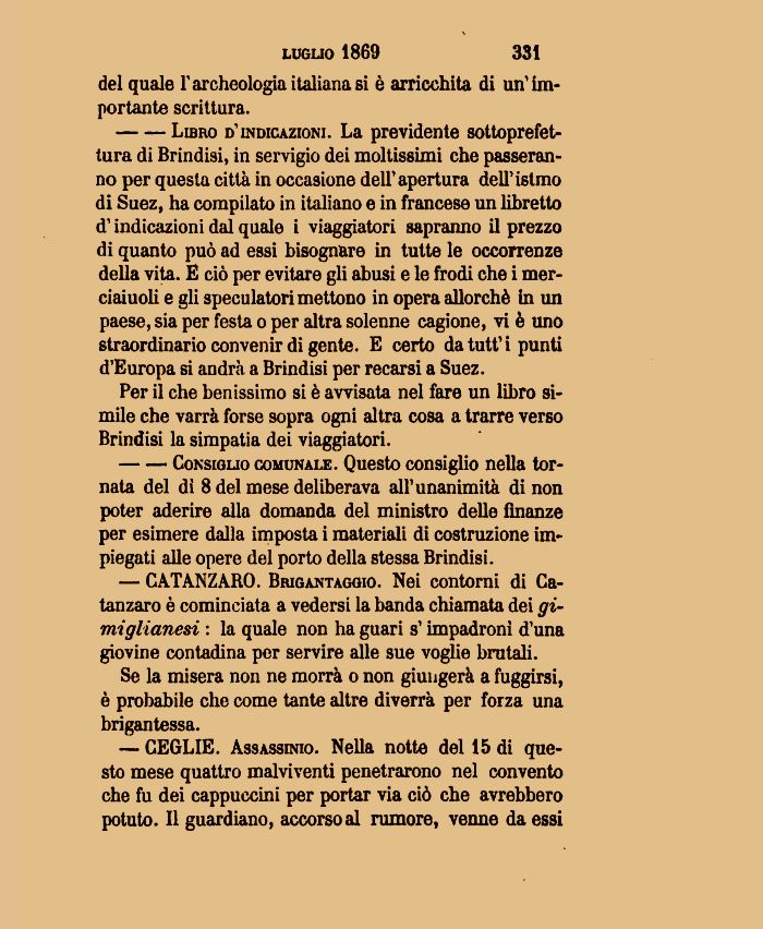 — CEGLIE. Assassinio. Nella notte del 15 di questo mese quattro malviventi penetrarono nel convento che fu dei cappuccini per portar via ciò che avrebbero potuto. Il guardiano, accorso al rumore, venne da essi