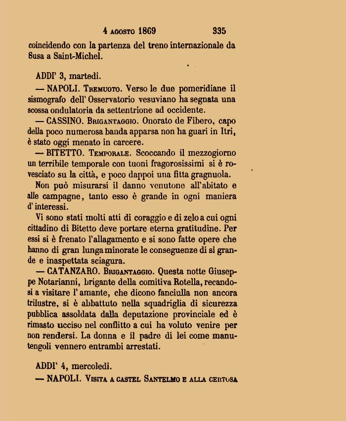 — CATANZARO. Brigantaggio. Questa notte Giuseppe Notarianni, brigante della comitiva Rotella, recandosi a visitare l'amante, che dicono fanciulla non ancora trilustre, si è abbattuto nella squadriglia di sicurezza pubblica assoldata dalla deputazione provinciale ed è rimasto ucciso nel conflitto a cui ha voluto venire per non rendersi. La donna e il padre di lei come manutengoli vennero entrambi arrestati,
