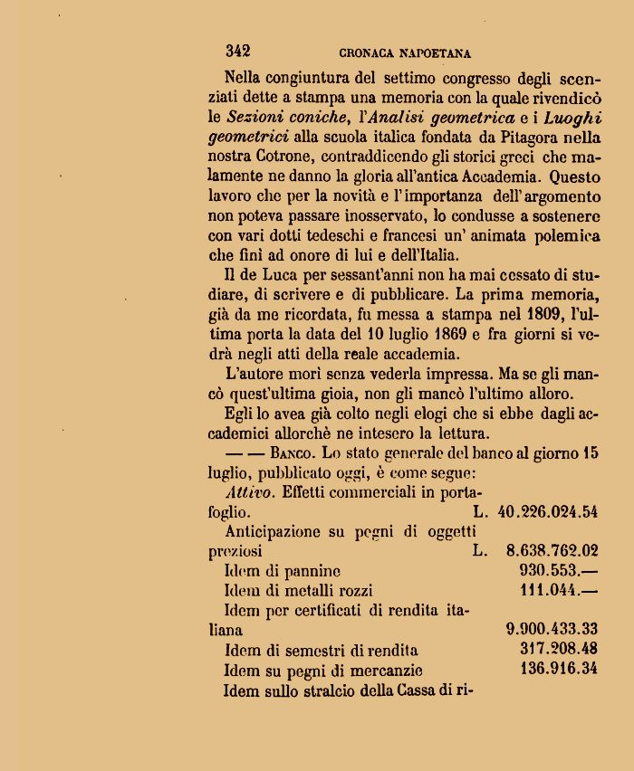 Nella congiuntura del settimo congresso degli scen-ziati dette a stampa una memoria con la quale rivendicò le Sezioni coniche, VAnalisi geometrica e i Luoghi geometrici alla scuola italica fondata da Pitagora nella nostra Gotrone, contraddicendo gli storici greci che malamente ne danno la gloria all'antica Accademia. Questo lavoro che per la novità e V importanza dell1 argomento non poteva passare inosservato, lo condusse a sostenere con vari dotti tedeschi e francesi un1 animata polemica che fini ad onore di lui e dell'Italia.