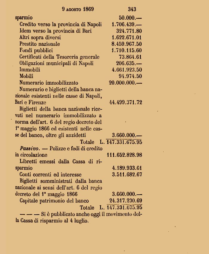 Libretti emessi dalla Cassa di risparmio 4.189.933.61 Conti correnti ed interesse 3.511.682.67 Biglietti somministrati dalla banca nazionale ai sensi dell'art. 6 del regio decreto del 1° maggio 1866 3.6G0.000.— Capitale patrimonio del banco 24.317.230.69