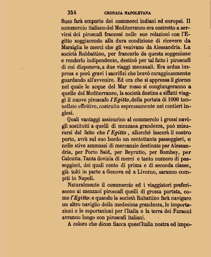 Quali vantaggi assicurino al commercio i grossi navigli sostituiti a quelli di mezzana grandezza, può misurarsi dal fatto che V Egitto , allorché lascerà il nostro porto, avrà sul suo bordo un centottanta passeggierì, e nelle stive ammassi di mercanzie destinate per Alessandria, per Porto Said, per Beyrutto, per Bombay, per Calcutta. Tanta dovizia di merci e tanto numero di passeggierì, dei quali cento di prima e di seconda classe, già tolti in parte a Genova ed a Livorno, saranno compiti in Napoli.