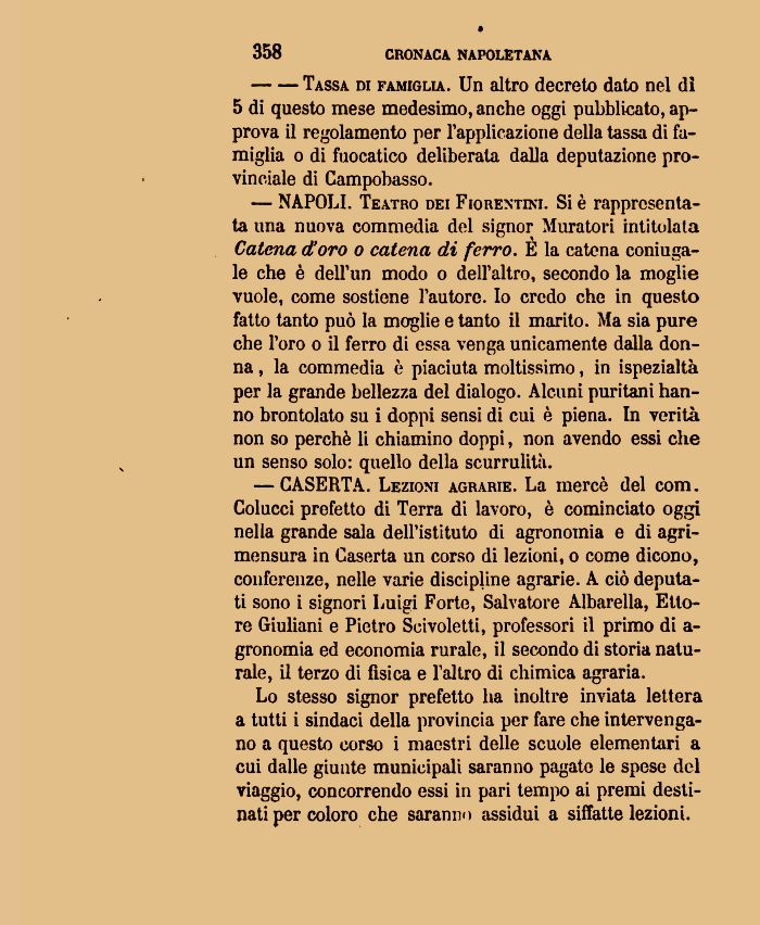 — NAPOLI. Teatro dei Fiorentini. Si è rappresentata una nuova commedia del signor Muratori intitolata Catena doro o catena di ferro. E la catena coniugale che è dell'un modo o dell'altro, secondo la moglie vuole, come sostiene l'autore. Io credo che in questo fatto tanto può la moglie e tanto il marito. Ma sia pure che l'oro o il ferro di essa venga unicamente dalla donna , la commedia è piaciuta moltissimo, in ispezialtà per la grande bellezza del dialogo. Alcuni puritani hanno brontolato su i doppi sensi di cui è piena. In verità non so perchè li chiamino doppi, non avendo essi che un senso solo: quello della scurrulità.