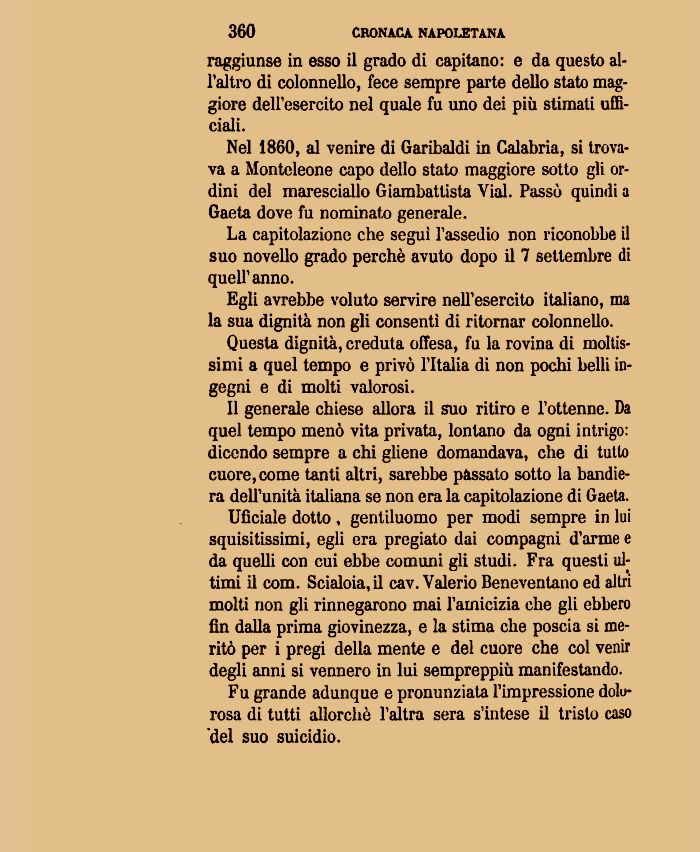 Il generale chiese allora il suo ritiro e l'ottenne. Da quel tempo menò vita privata, lontano da ogni intrigo: dicendo sempre a chi gliene domandava, che di tutto cuore, come tanti altri, sarebbe passato sotto la bandiera dell'unità italiana se non era la capitolazione di Gaeta.