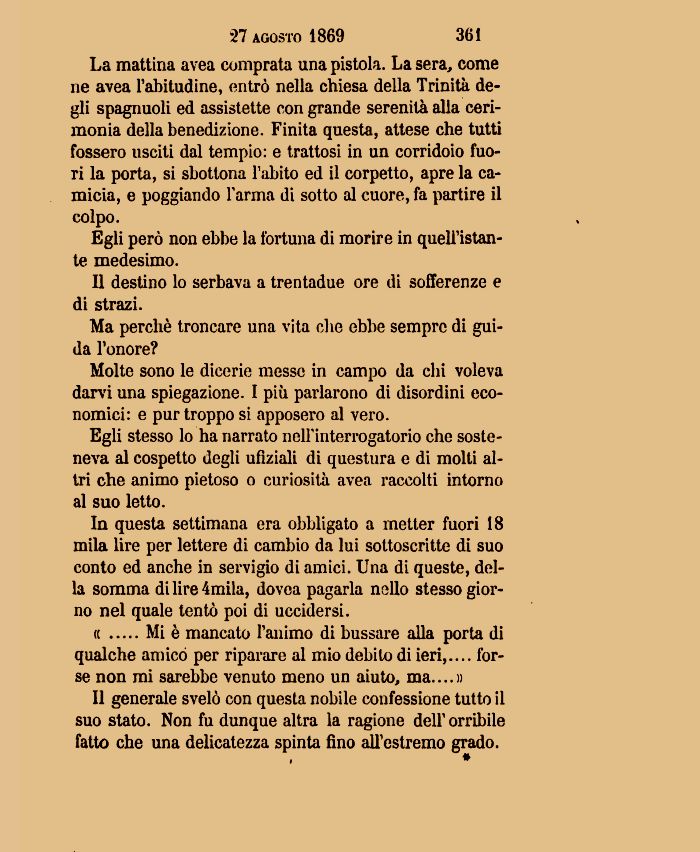 In questa settimana era obbligato a metter fuori 18 mila lire per lettere di cambio da lui sottoscrìtte di suo conto ed anche in servigio di amici. Una di queste, della somma dilire4mila, dovea pagarla nello stesso giorno nel quale tentò poi di uccidersi.