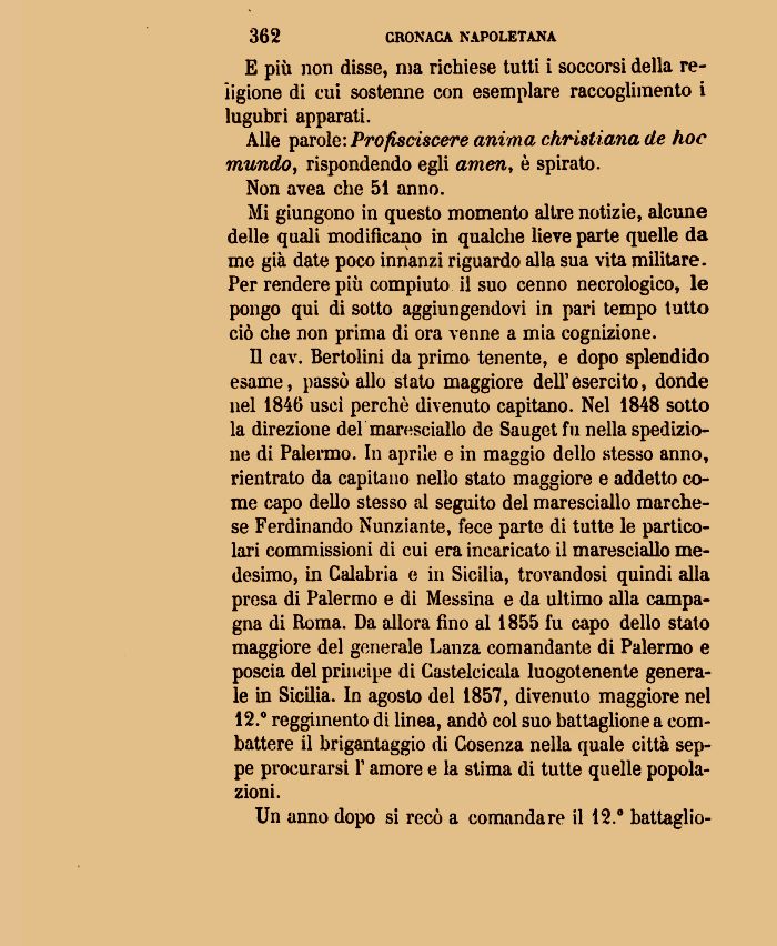 Il cav. Bertolini da primo tenente, e dopo splendido esame, passò allo stato maggiore dell' esercito, donde nel 1846 uscì perchè divenuto capitano. Nel 1848 sotto la direzione del maresciallo de Saugetfu nella spedizione di Palermo. In aprile e in maggio dello stesso anno, rientrato da capitano nello stato maggiore e addetto come capo dello stesso al seguito del maresciallo marchese Ferdinando Nunziante, fece parte di tutte le particolari commissioni di cui era incaricato il maresciallo medesimo, in Calabria e in Sicilia, trovandosi quindi alla presa di Palermo e di Messina e da ultimo alla campagna di Roma. Da allora fino al 1855 fu capo dello stato maggiore del generale Lanza comandante di Palermo e poscia del principe di Casteleicala luogotenente generale in Sicilia. In agosto del 1857, divenuto maggiore nel 12.° reggimento di linea, andò col suo battaglione a combattere il brigantaggio di Cosenza nella quale città seppe procurarsi l'amore e la stima di tutte quelle popolazioni.