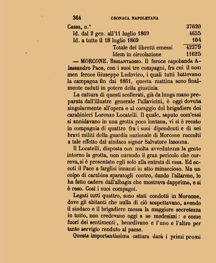 La cattura di questi scellerati, già da lunga mano preparata dall'illustre generale Pallavicini, è oggi dovuta singolarmente all'opera e al coraggio del brigadiere dei carabinieri Lorenzo Locateli!. Il quale, saputo com'essi si annidavano in una grotta poco lontana, vi si è recato in compagnia di quattro fra i suoi dipendenti e di sei bravi mìliti della guardia nazionale di Morcone raccolti a tale effetto dal sindaco signor Salvatore lasonna.