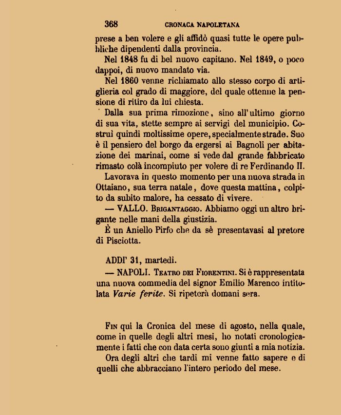 Fin qui la Cronica del mese di agosto, nella quale, come in quelle degli altri mesi, ho notati cronologicamente i fatti che con data certa sono giunti a mia notizia.