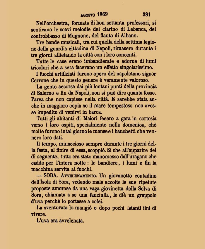 La gente accorsa dai più lontani punti della provincia di Salerno e fin da Napoli, non si può dire quanta fosse. Parea che non capisse nella città. E sarebbe stata anche in maggiore copia se il mare tempestoso non avesse impedito di venirvi in barca.