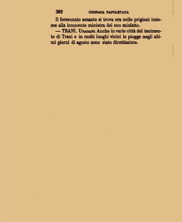 — TRANI. Uragani. Anche in varie città del lenimento di Tram e in molti luoghi vicini le piogge negli ultimi giorni di agosto sono state dirottissime.